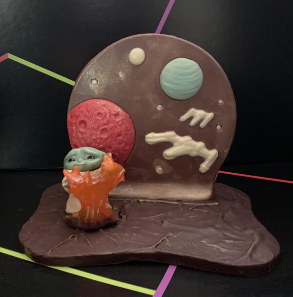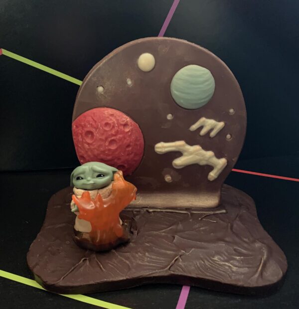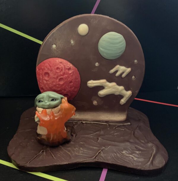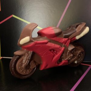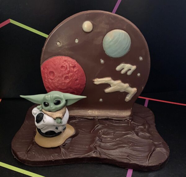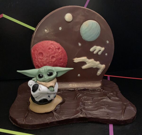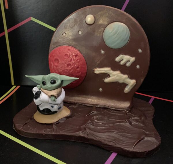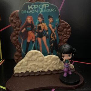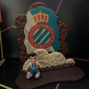 Figura realizada con chocolate con leche y chocolate blanco las medidas son 18x13x15cm.Pesa 410 gramos viene acompañado de con su muñeco hay 5 modelos se puede elegir si lo tenemos, si no llevara el que este disponible .