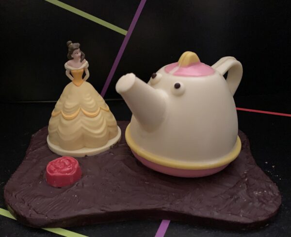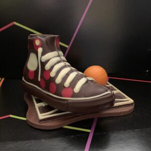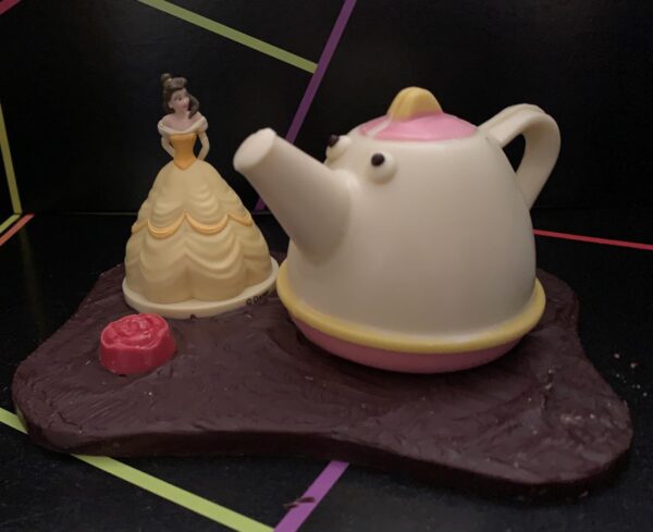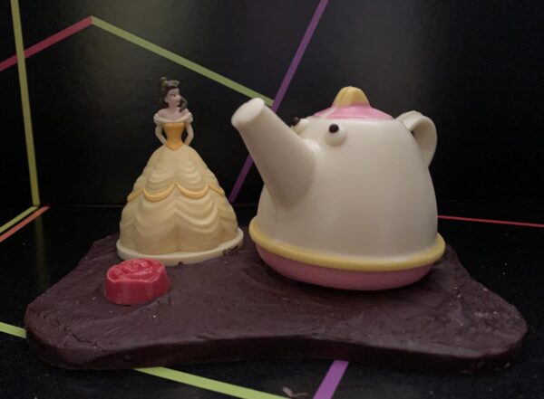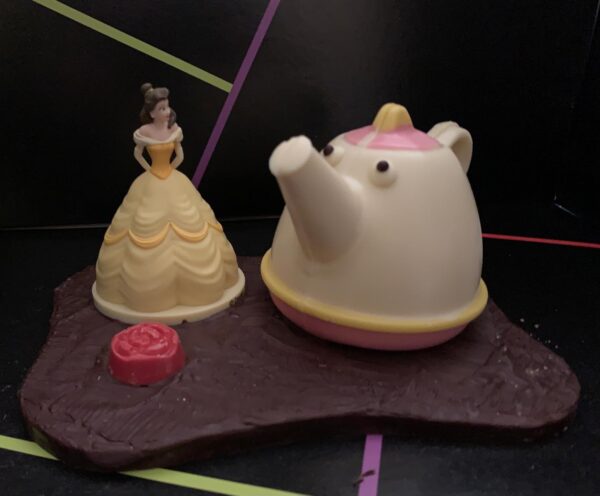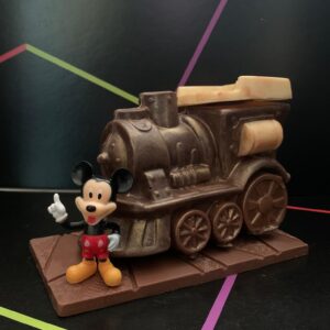 Figura realizada con chocolate blanco , medida 18x13x 15 cm.Pesa 360 gramos y va acompañada con su muñeca y su caja correspondiente.