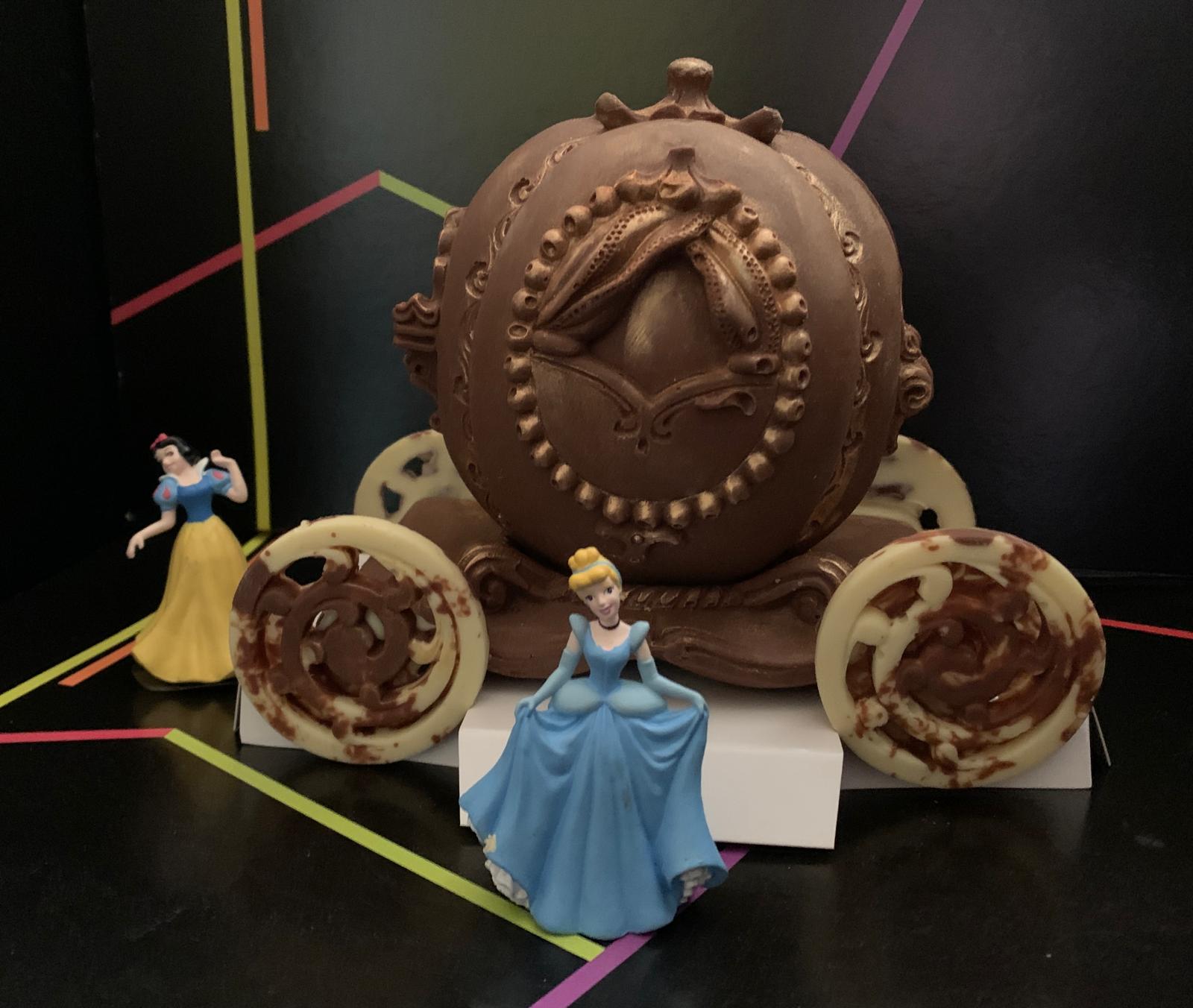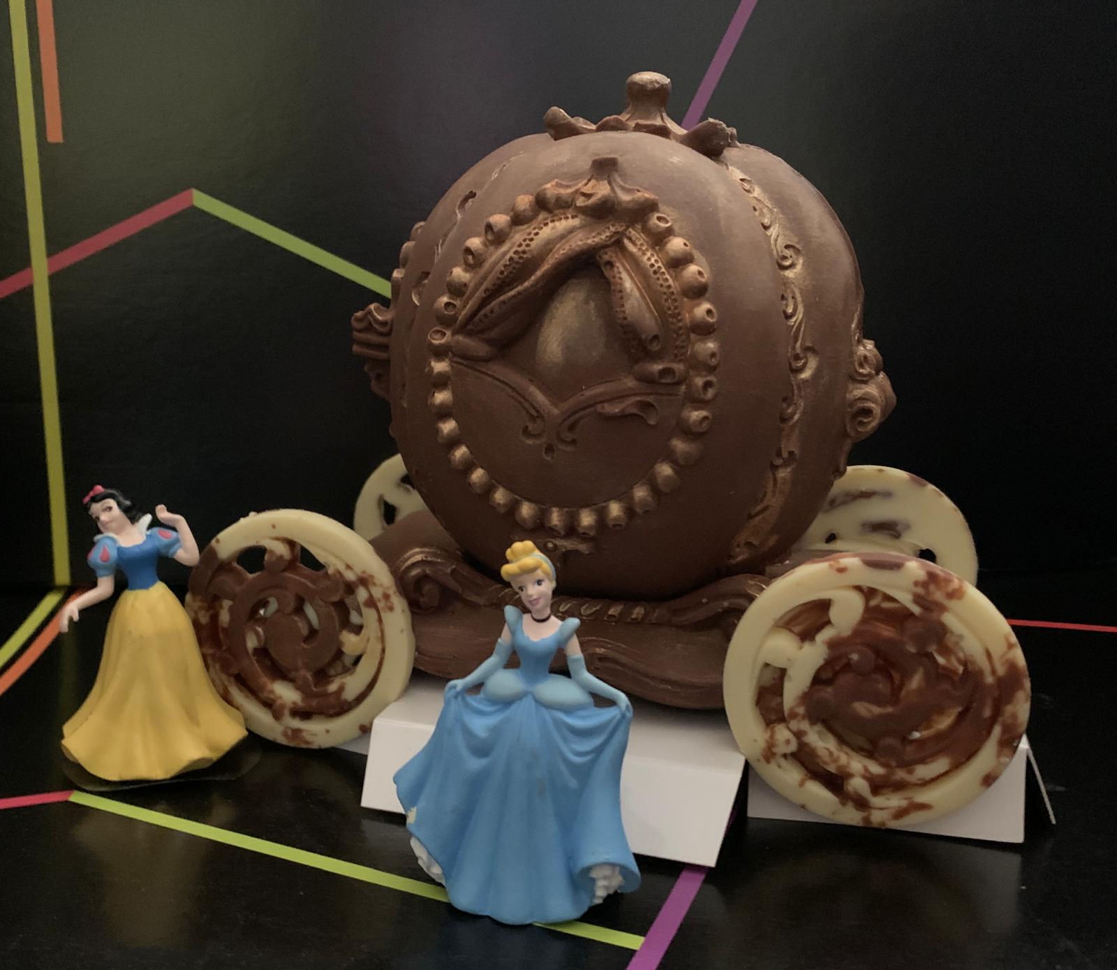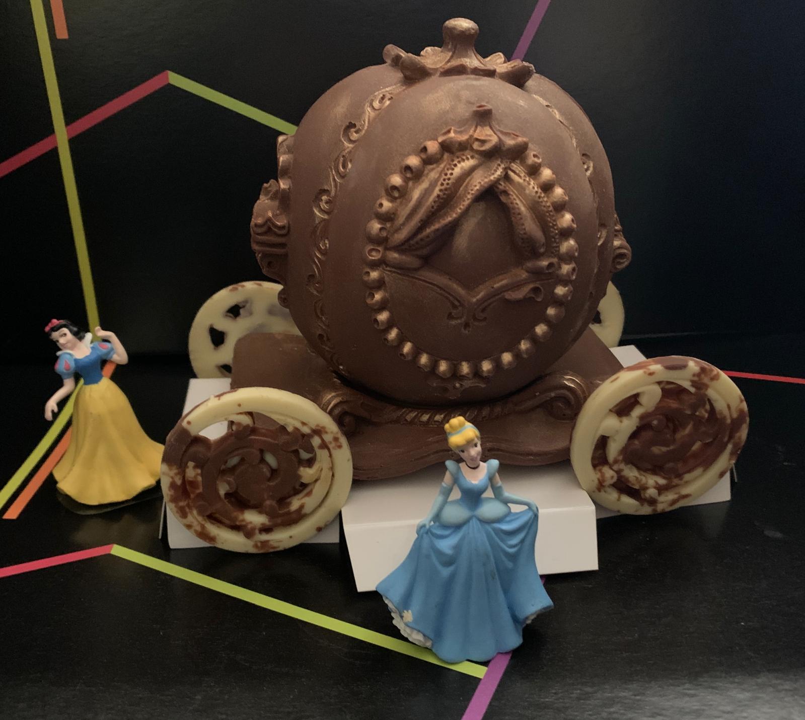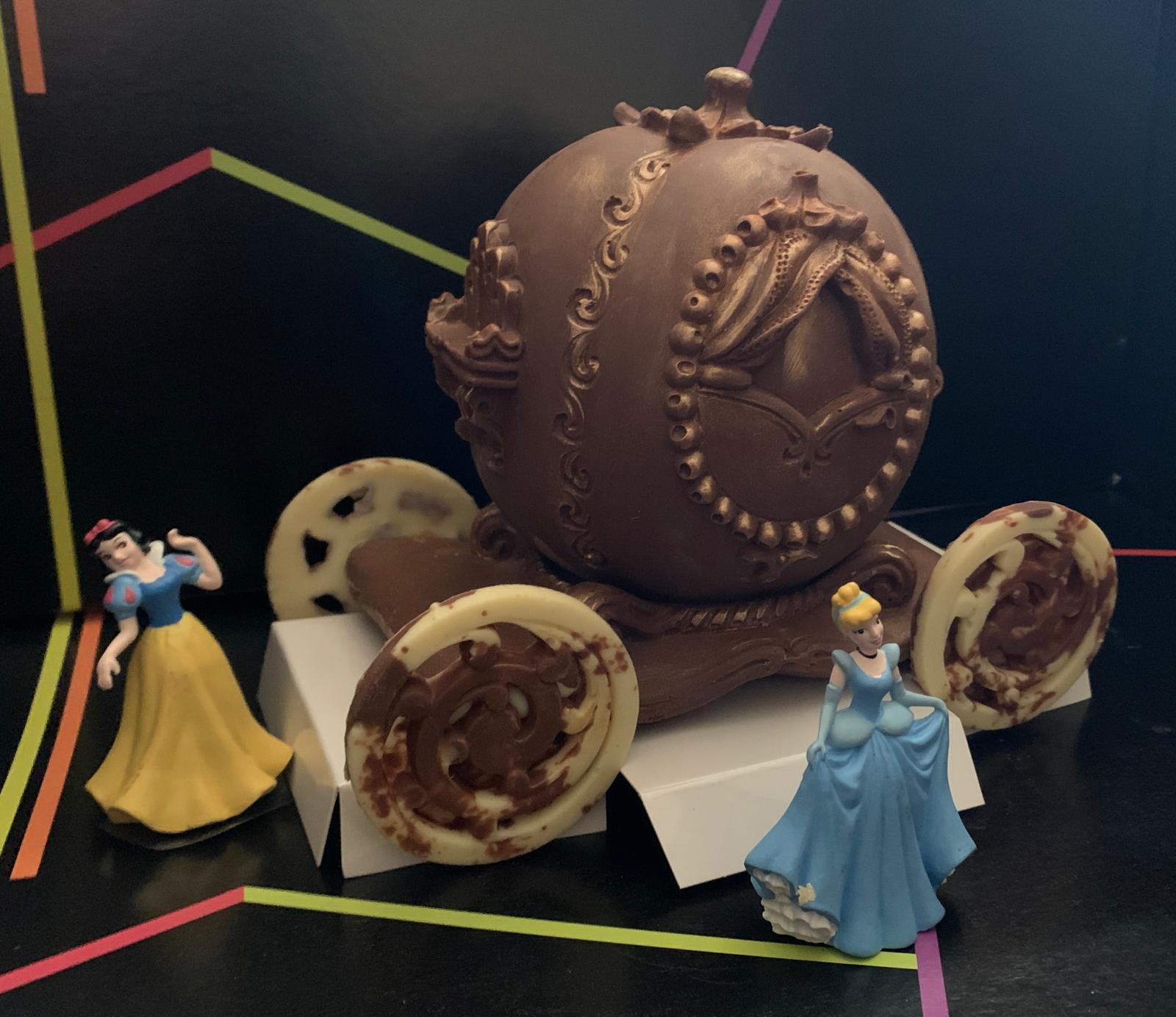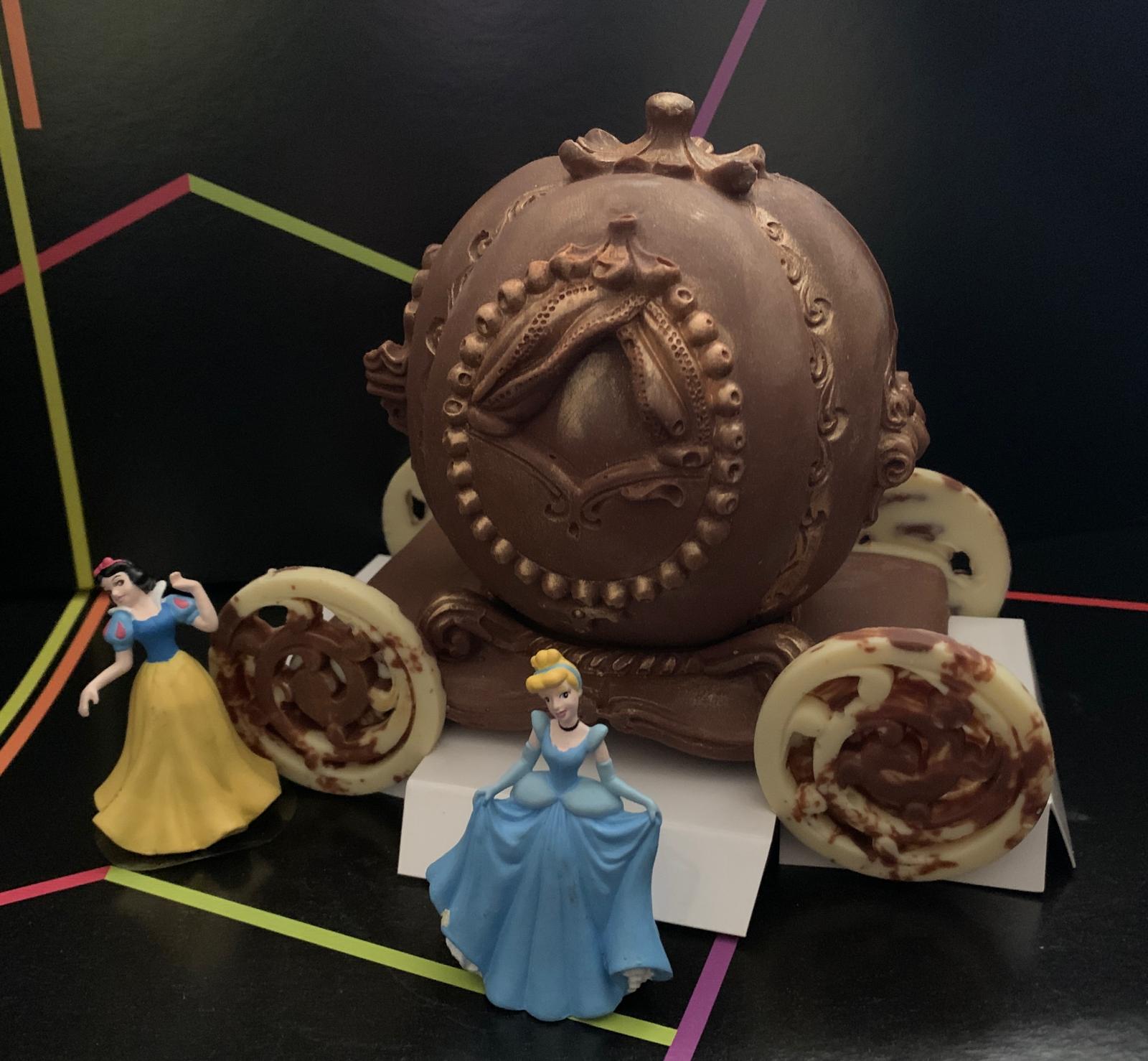 figura de carroza princesa de chocolate con lehe y chocolate blanco coloreado