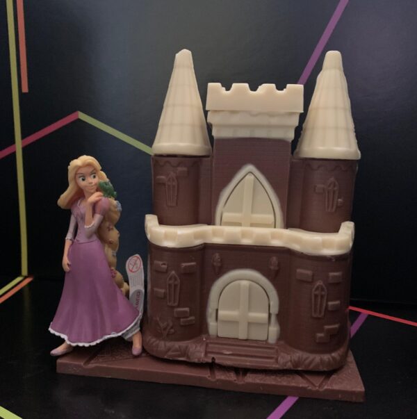 Figura de chocolate realizada con chocolate con leche y decorado con chocolate blanco