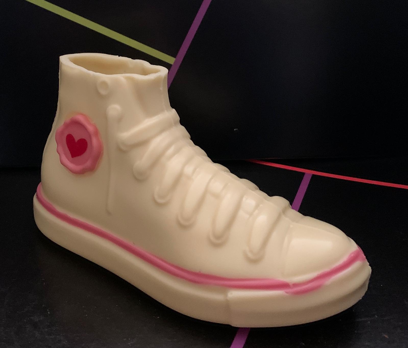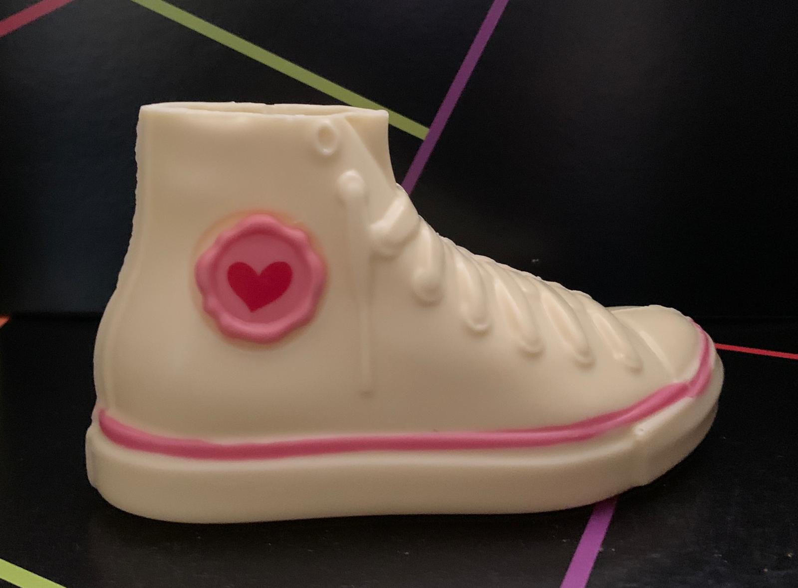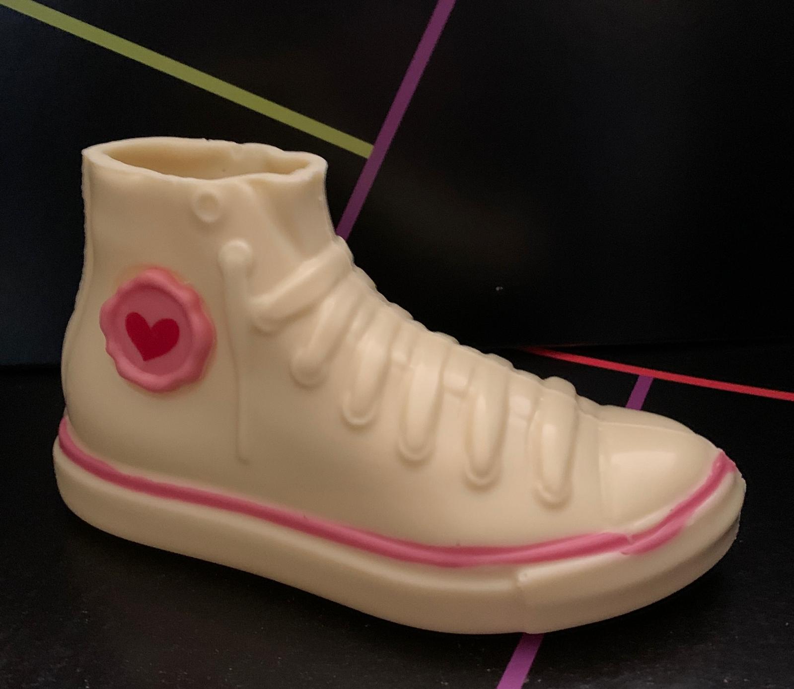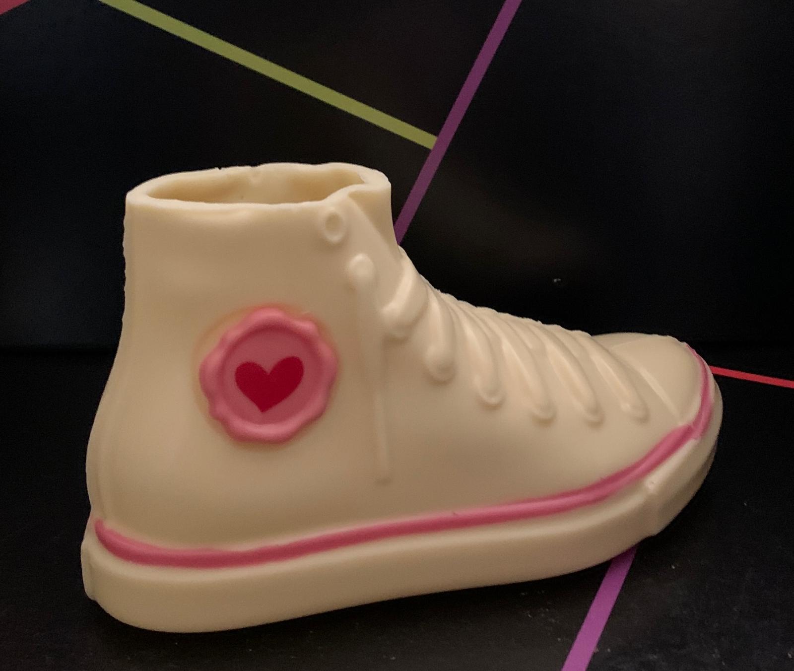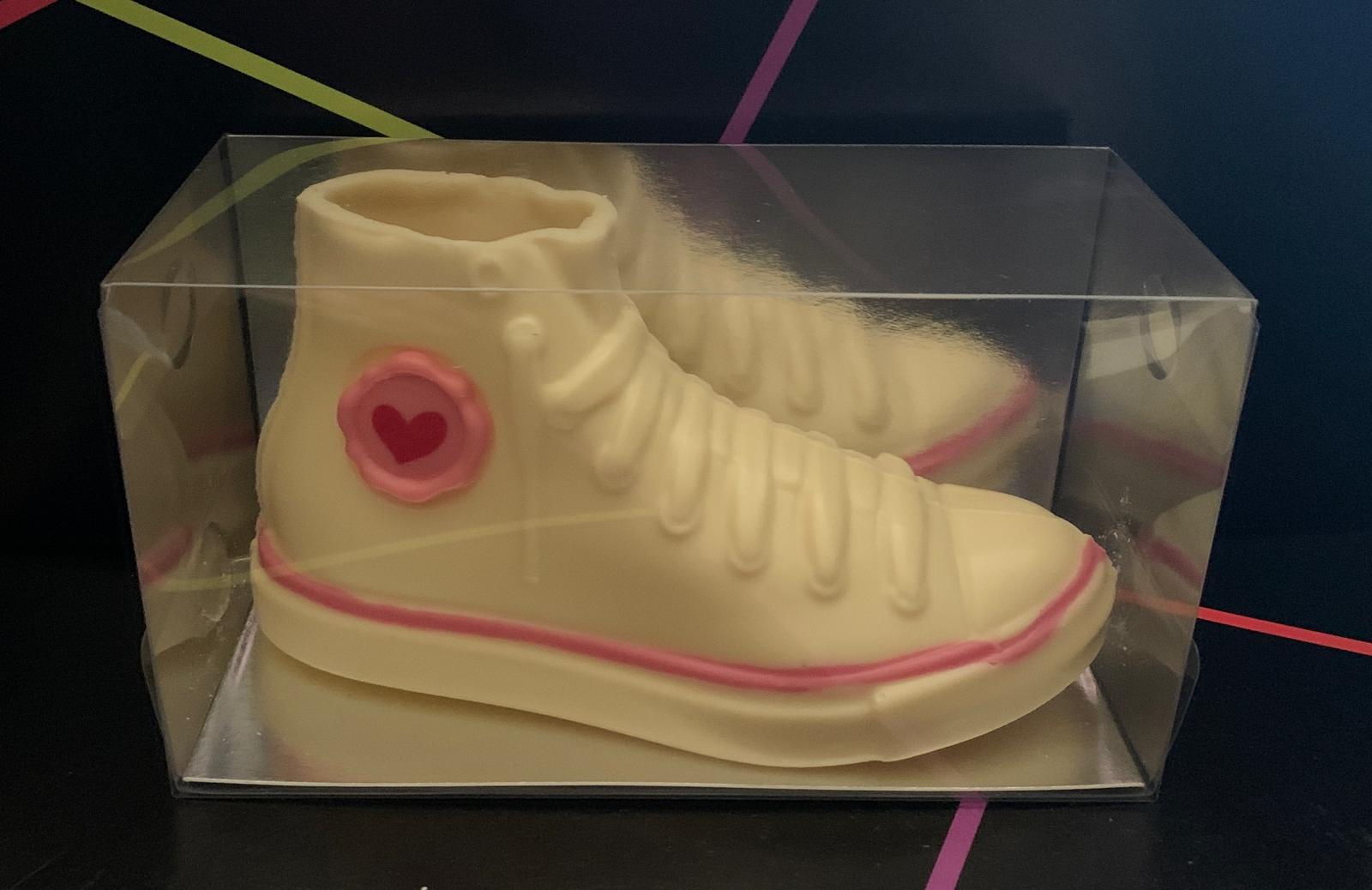 Figura realizada en chocolate blanco y decorada en color rosa como una zapatilla Converse. Mide unos 18 cm. Va con su caja correspondiente y pesa 160 gramos
