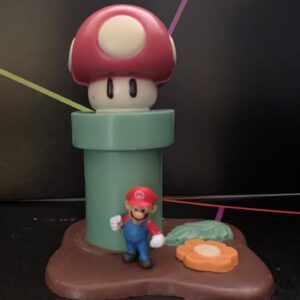Figura de huevo hecho con chocolate negro y blanco decorado con la temática, mide 12 x 8x 13 alto cm. Pesa 145 gramos. Viene acompañado en su caja y muñeco correspondiente , no siempre será el muñeco de Mario Bros puede ser cualquier personaje Luigi,princesaPeach,Bowser,Toad,Yoshi,Donkeykong.
