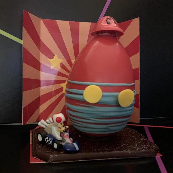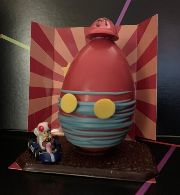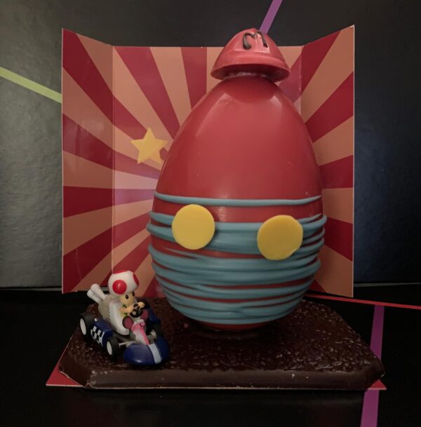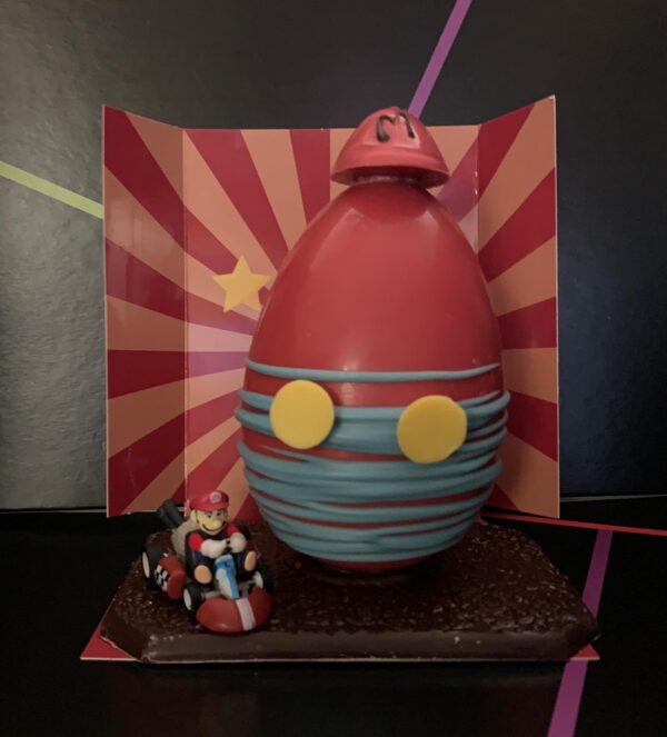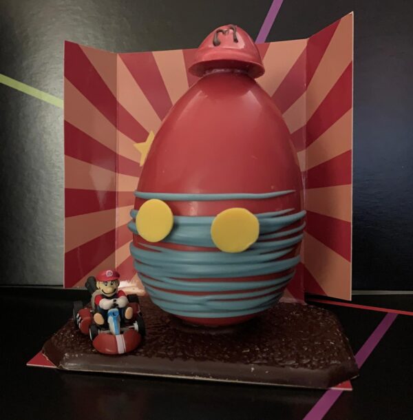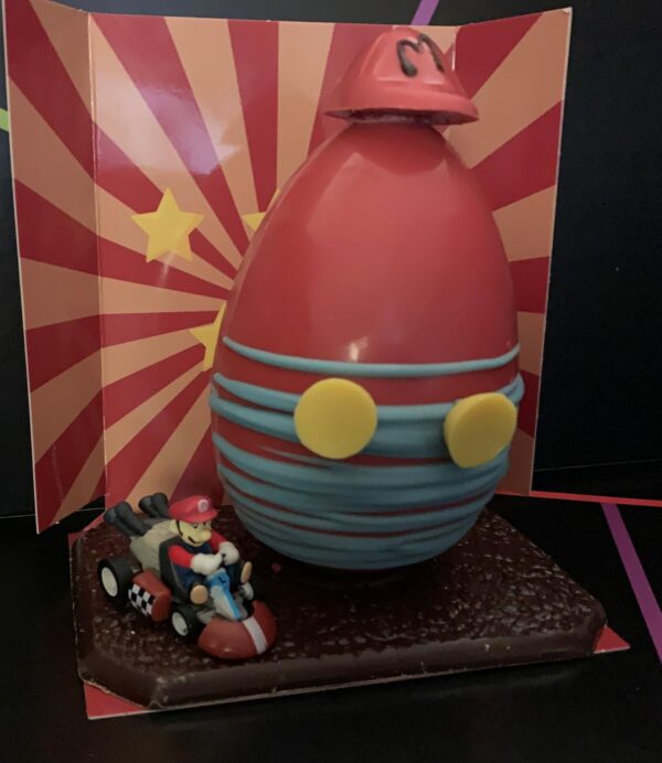 Figura de huevo hecho con chocolate negro y blanco decorado con la temática, mide 12 x 8x 13 alto cm. Pesa 145 gramos. Viene acompañado en su caja y muñeco correspondiente , no siempre será el muñeco de Mario Bros puede ser cualquier personaje Luigi,princesaPeach,Bowser,Toad,Yoshi,Donkeykong.