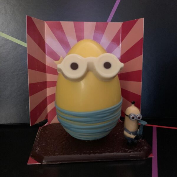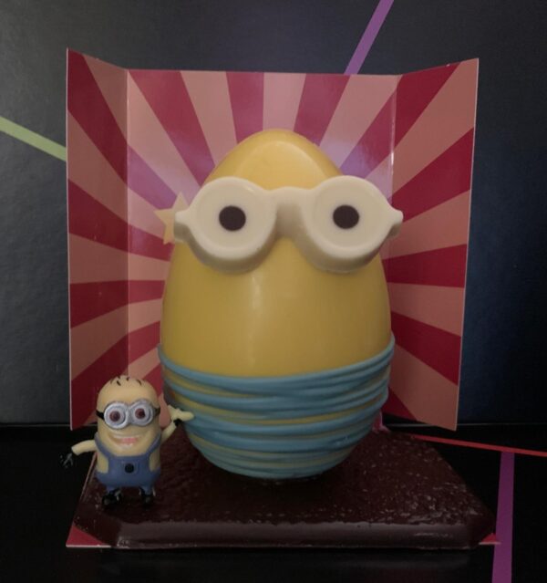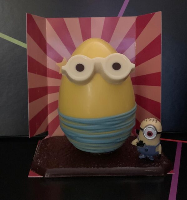 Figura de huevo de chocolate blanco y con base con chocolate negro ,mide 12 x 8 x 13 alto cm. Pesa 145 gramos y va acompañado de su muñeco y con su caja correspondiente