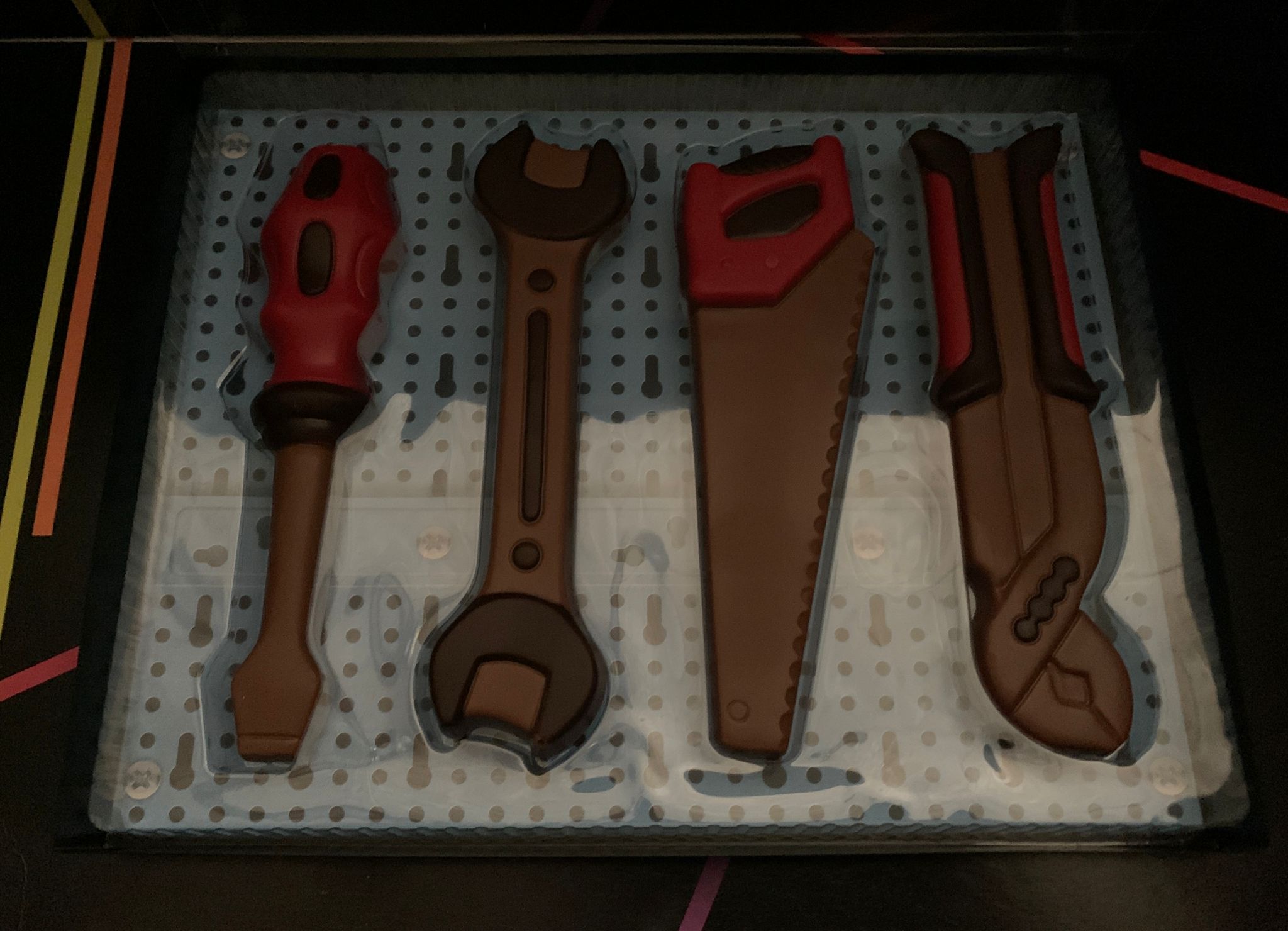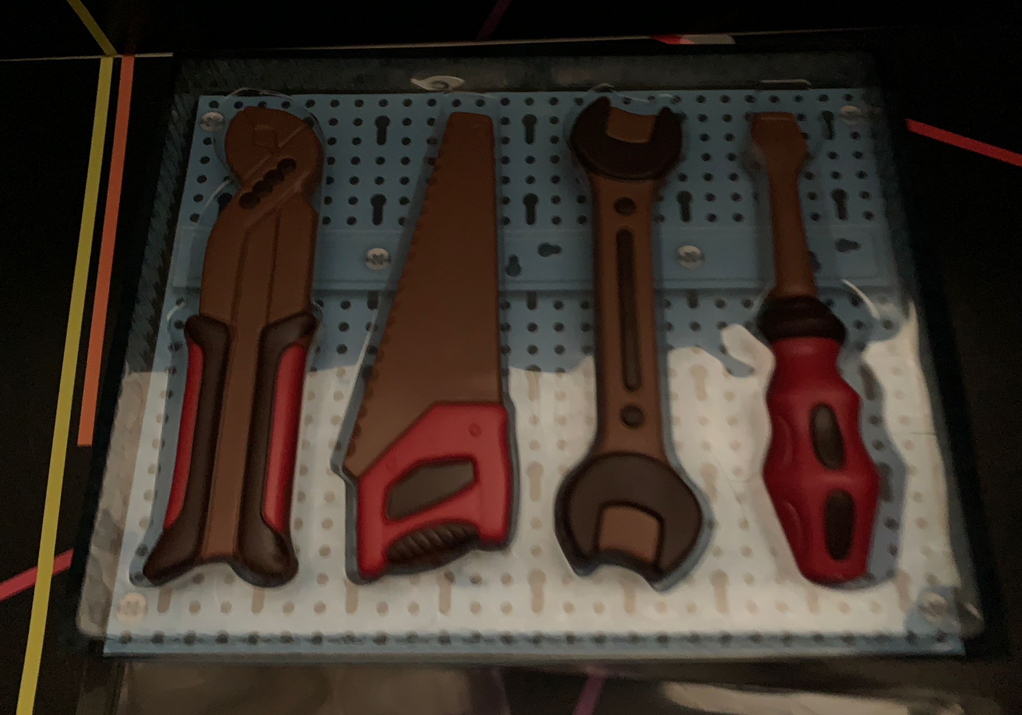 Figuras de chocolate con leche y decorado en color rojo , mide 24 x 19.5 cm. y pesa 150 gramos . Viene presentado en una caja .