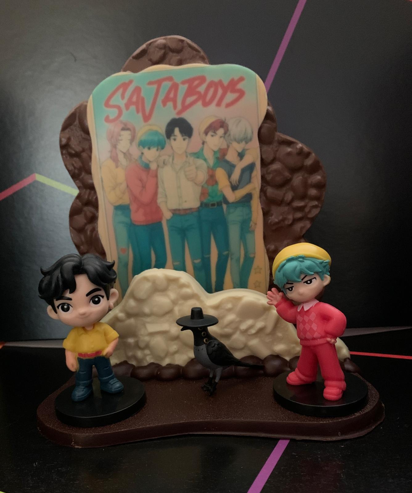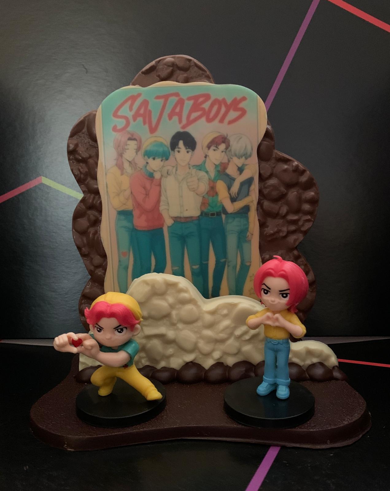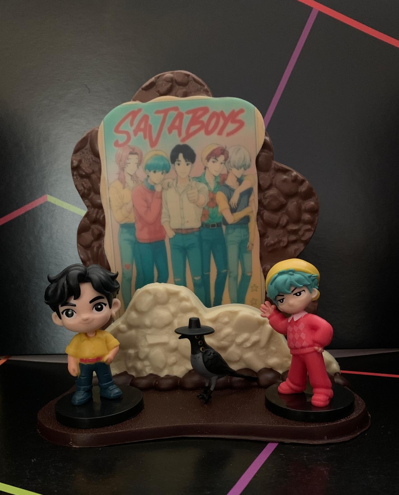 Serigrafía de chocolate realizada con chocolate blanco, con leche y negro , medidas 19x14x122cm. 480 gr. Viene acompañado de sus muñecos , será aleatorio