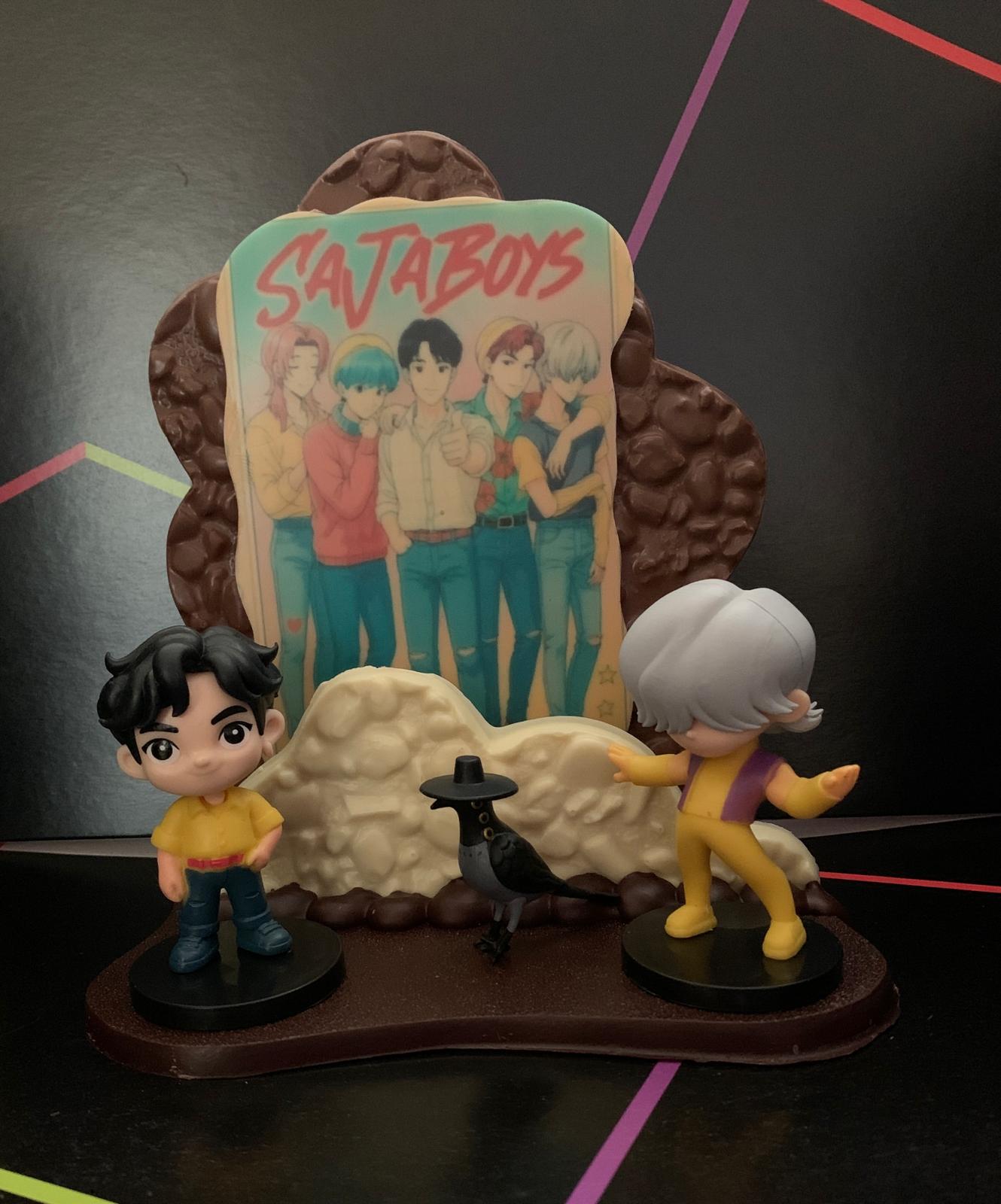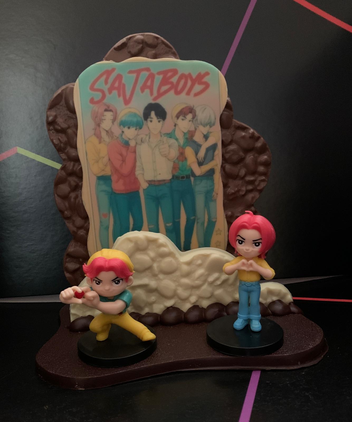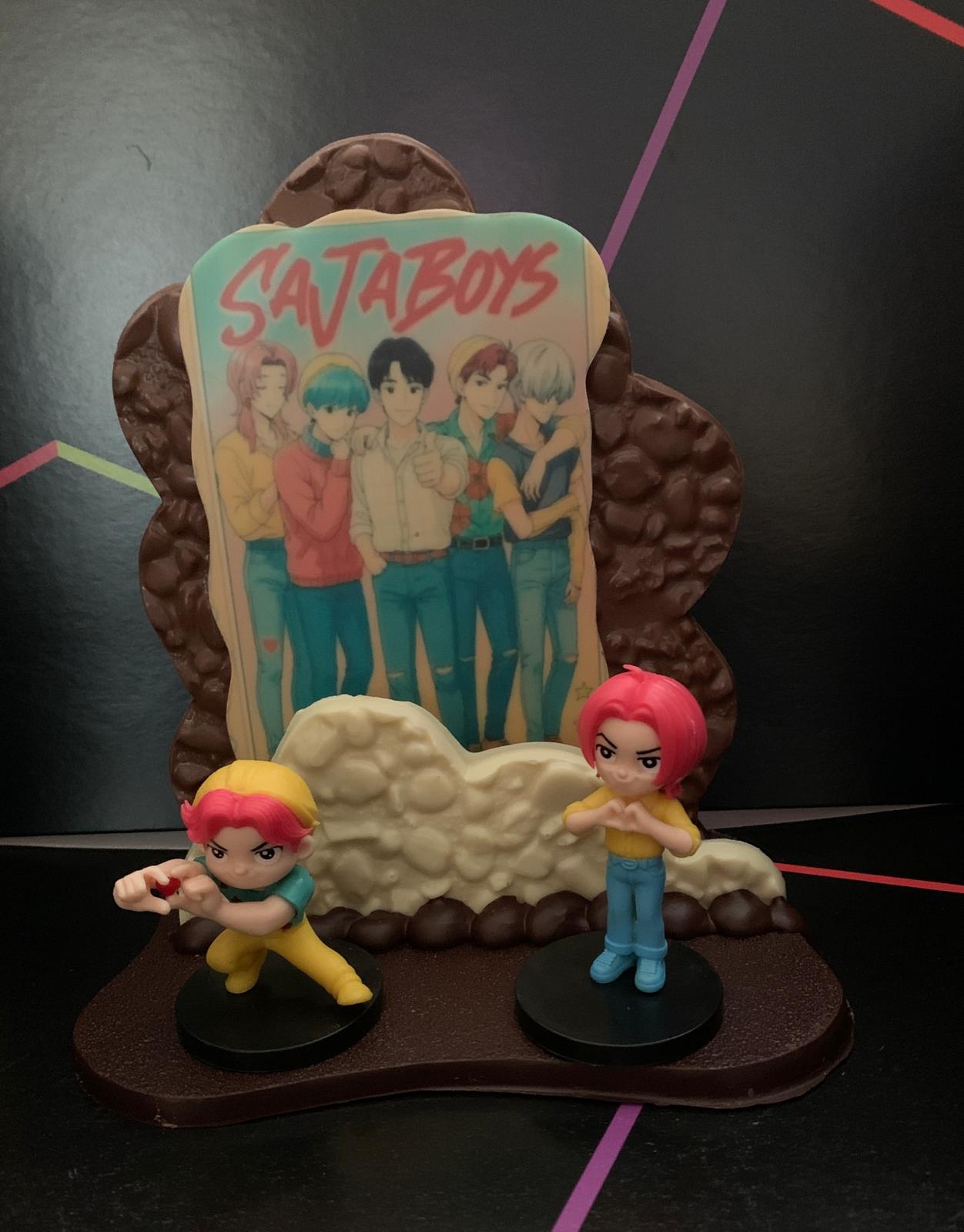 Serigrafía de chocolate realizada con chocolate blanco, con leche y negro , medidas 19x14x122cm. 480 gr. Viene acompañado de sus muñecos , será aleatorio