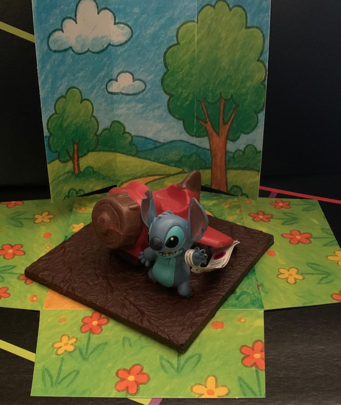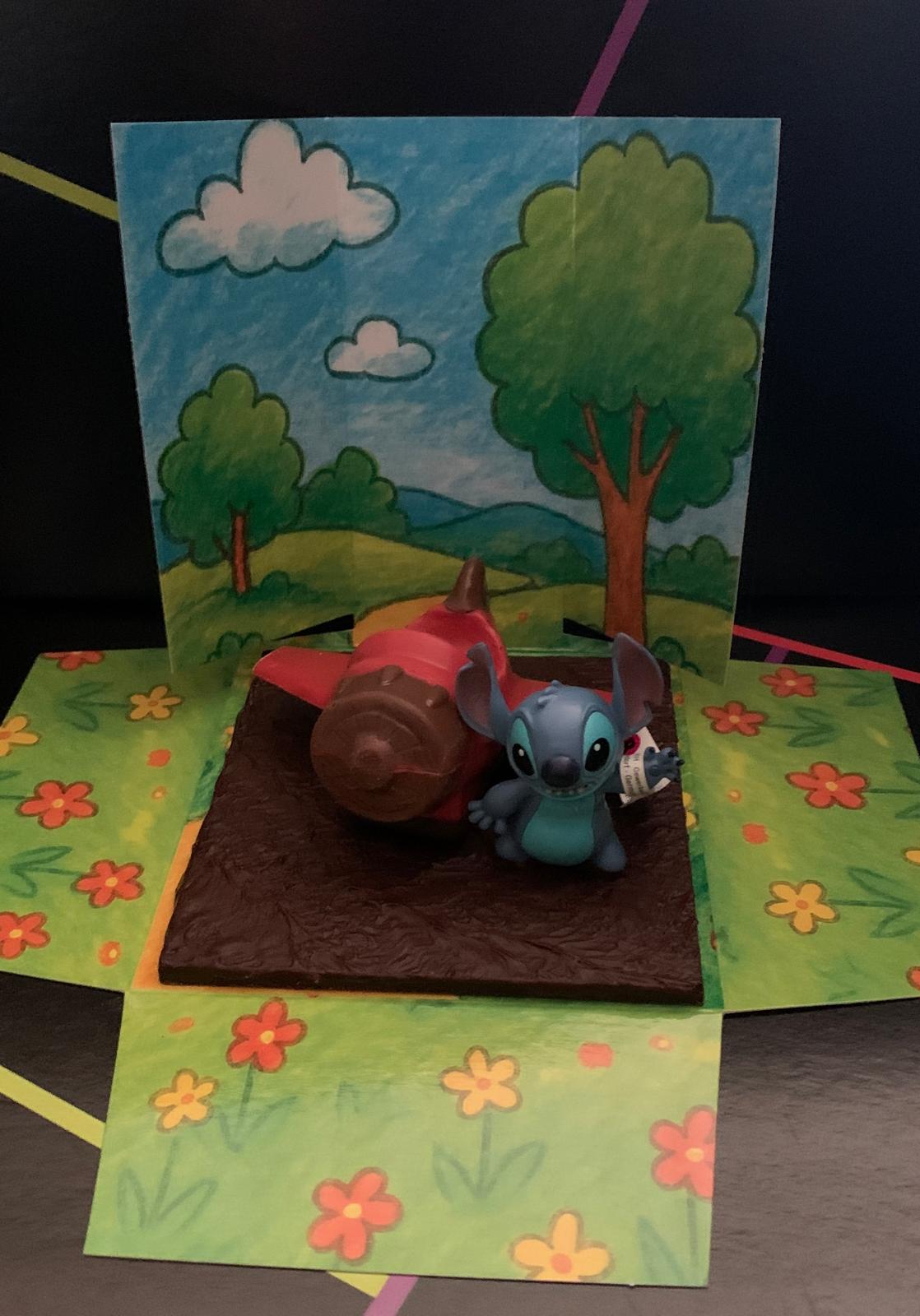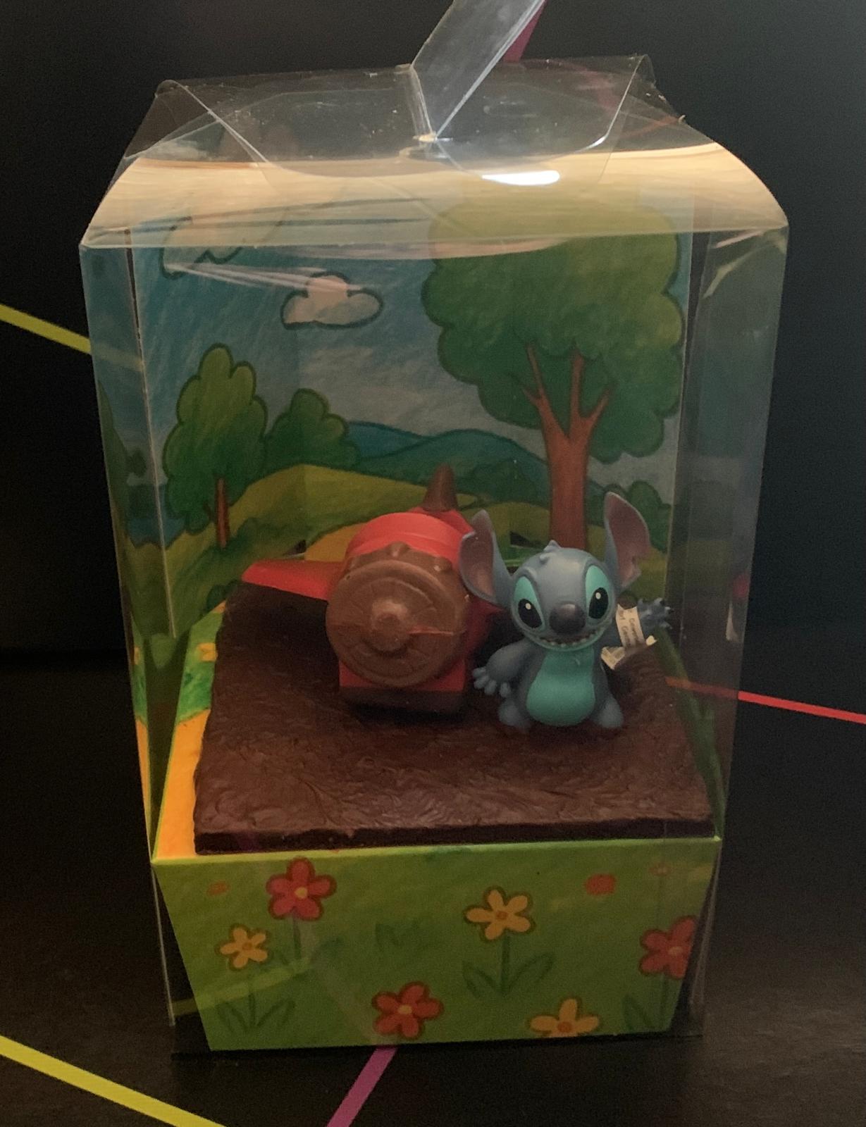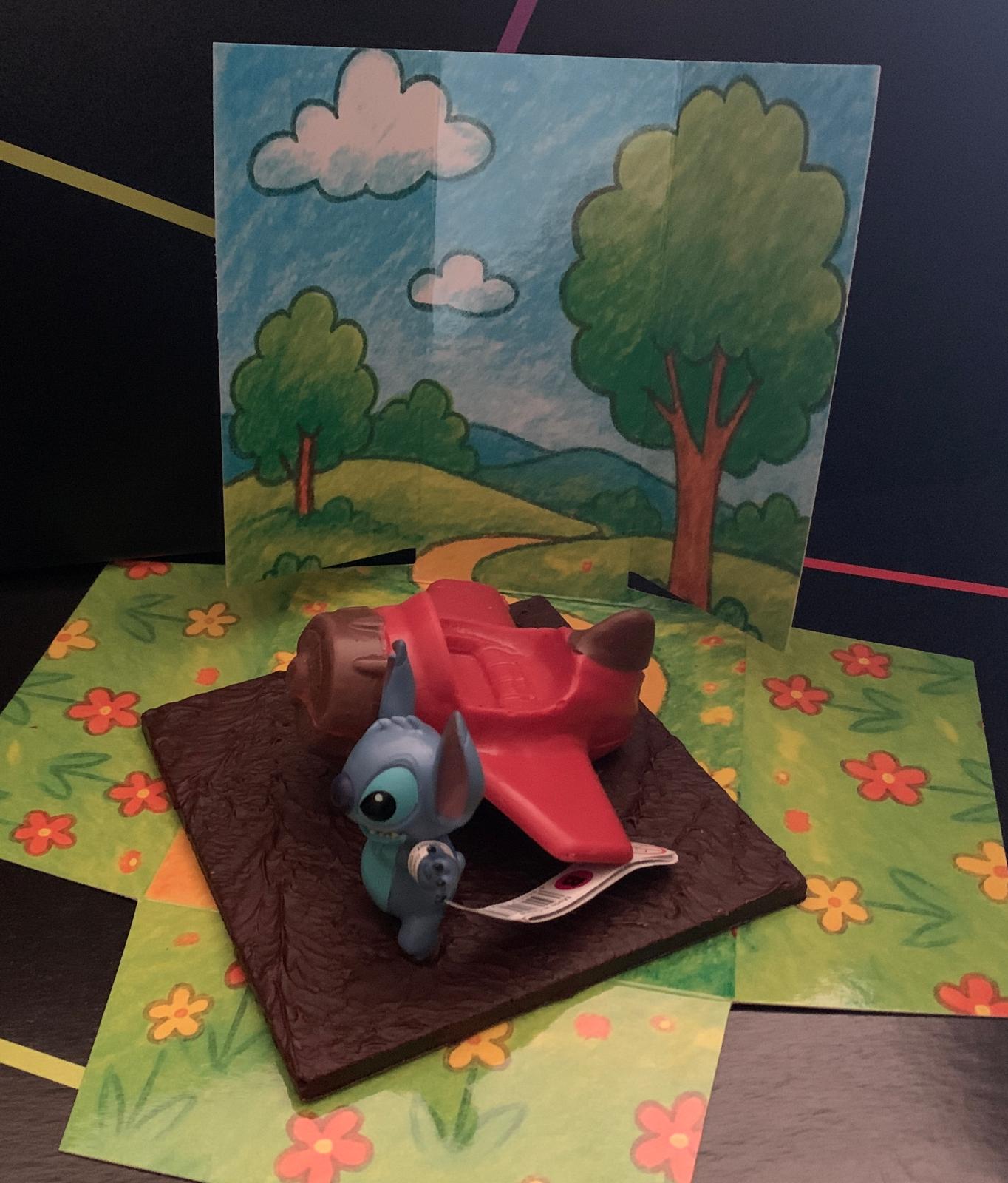 Figura de avión con base hecho con chocolate con leche y negro con muñeco de stitch