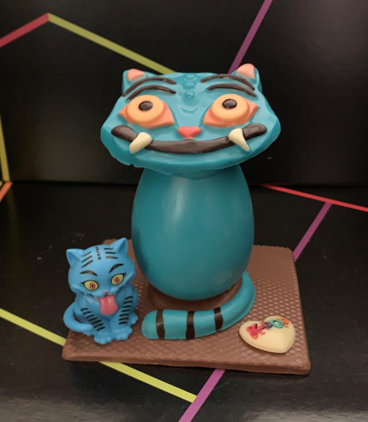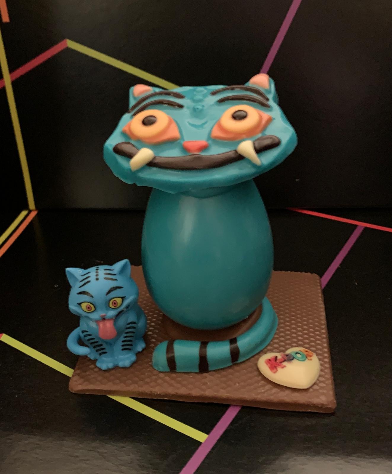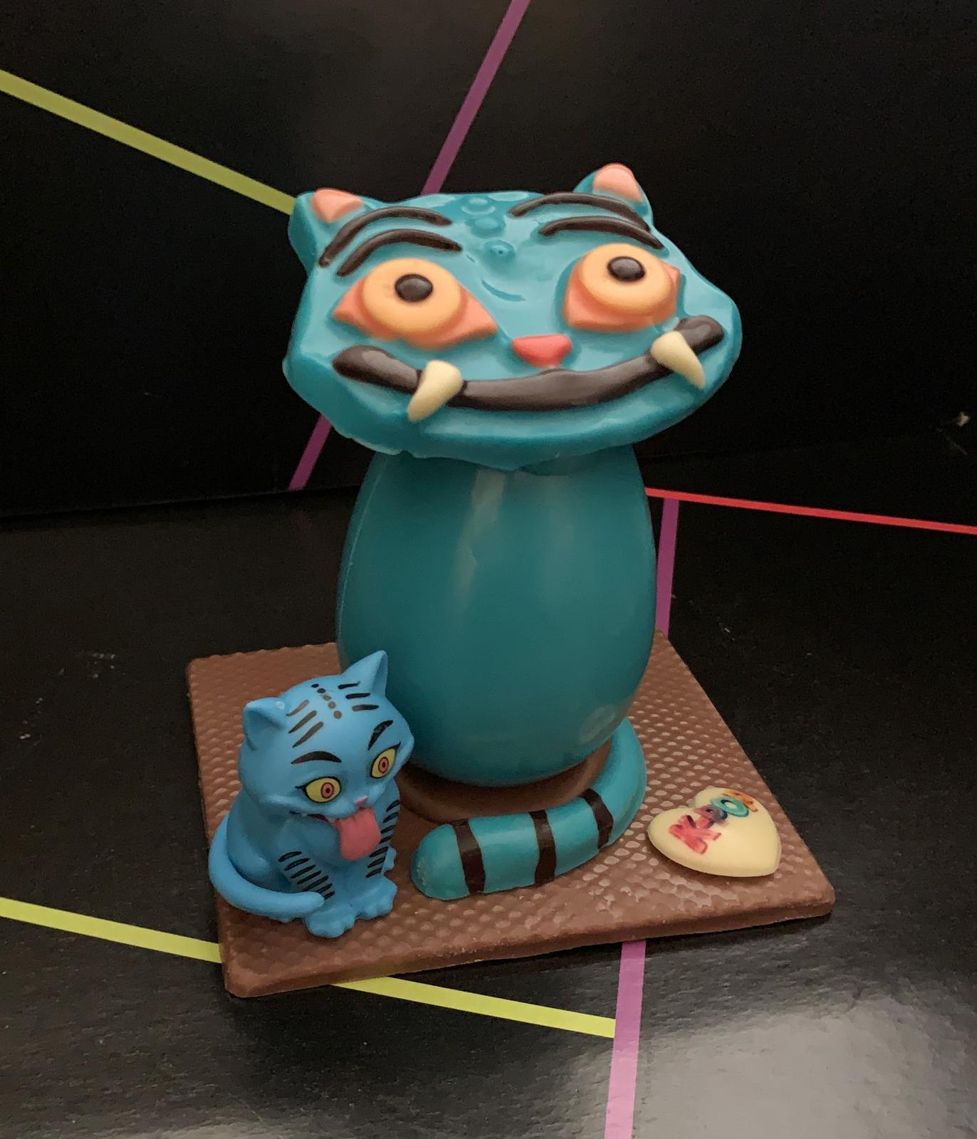 Figura de tigre azul de K-Pop realizada con chocolate con leche y decorada con chocolate blanco y negro pesa 250 gramos y las medidas son unos 13 x 13 x16 cm.Viene acompañado de su muñeco