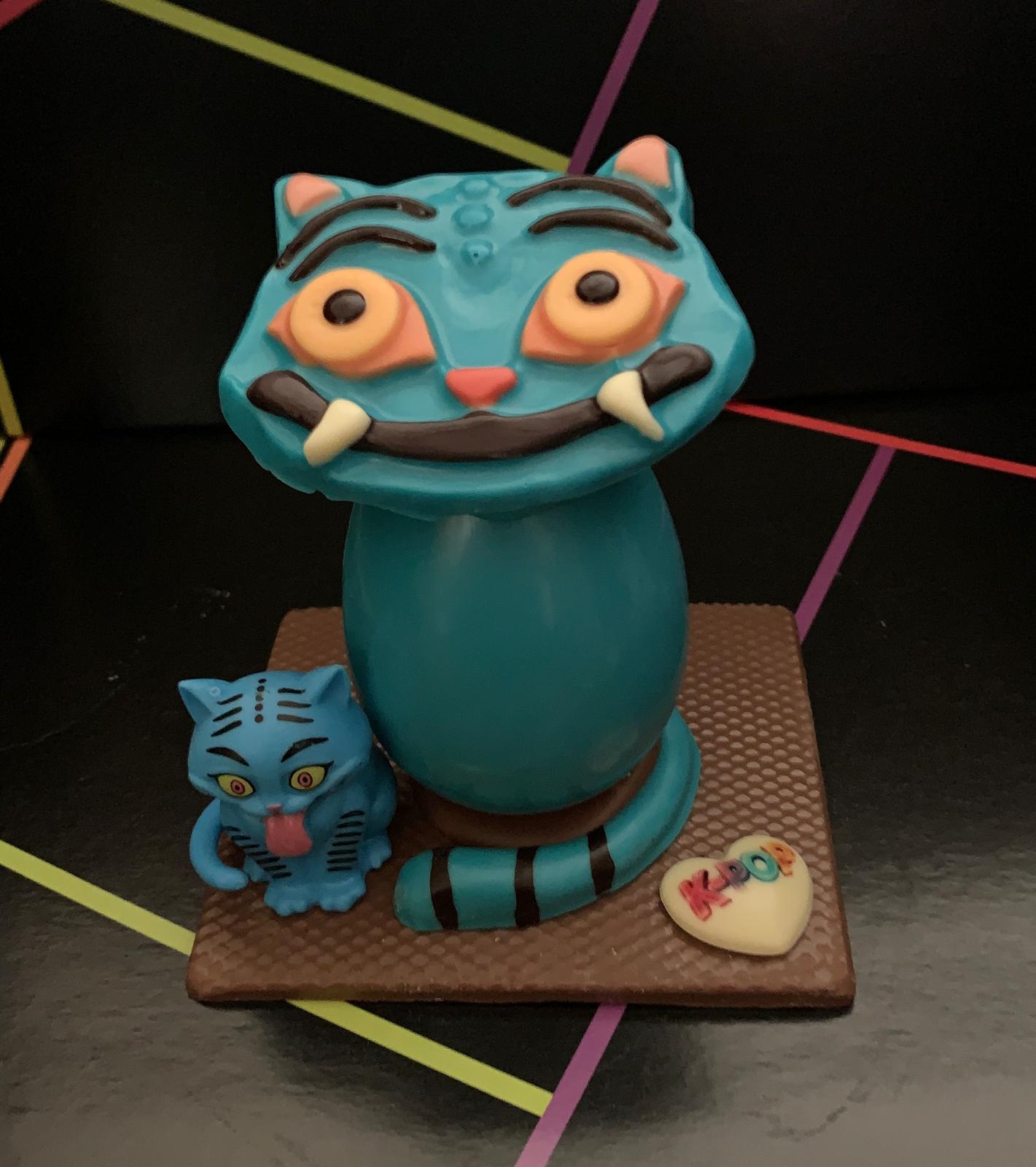 Figura de tigre azul K-Pop realizada de chocolate con leche y decorado con chocolate blanco ,negro , viene acompañado de su muñeco