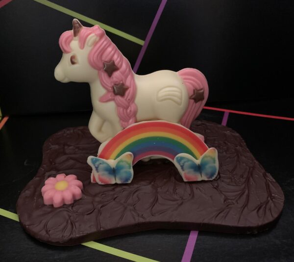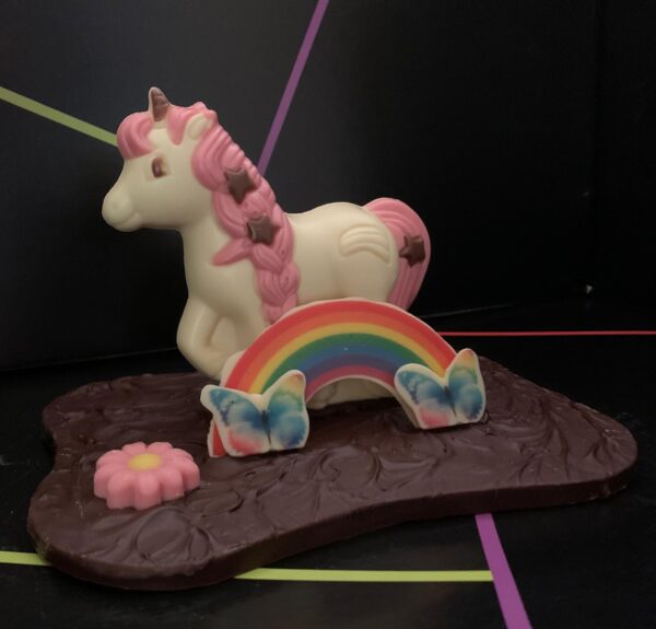 Figura de chocolate blanco decorado y con base de chocolate blanco y mide 19x13x19 cm. pesa 350 gramos . Viene presentado en su caja correspondiente